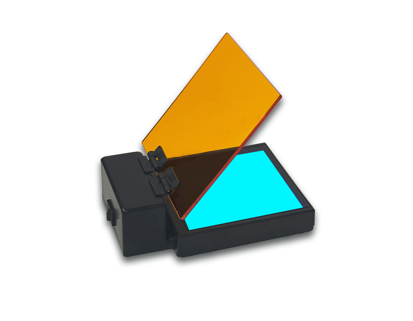 Adjustable filter cover: Both the E4101 and E4000 transilluminators come with emission filter covers. These amber covers, which rest above the viewing surface and gel, filter out the blue light, allowing the fluorescing DNA bands to be seen clearly. The covers can be set to a flat position for general gel viewing or can be set at an angle to provide easy access to the gel for band excision. The E4000 has a two-position filter cover, and the E4101 features a hinged filter cover.